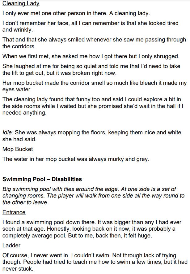 As this was a smaller project the core design document was a single page (included below) and a script for each interactable object in the game in chronological order (sample below).