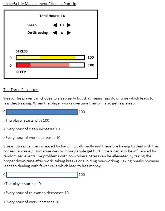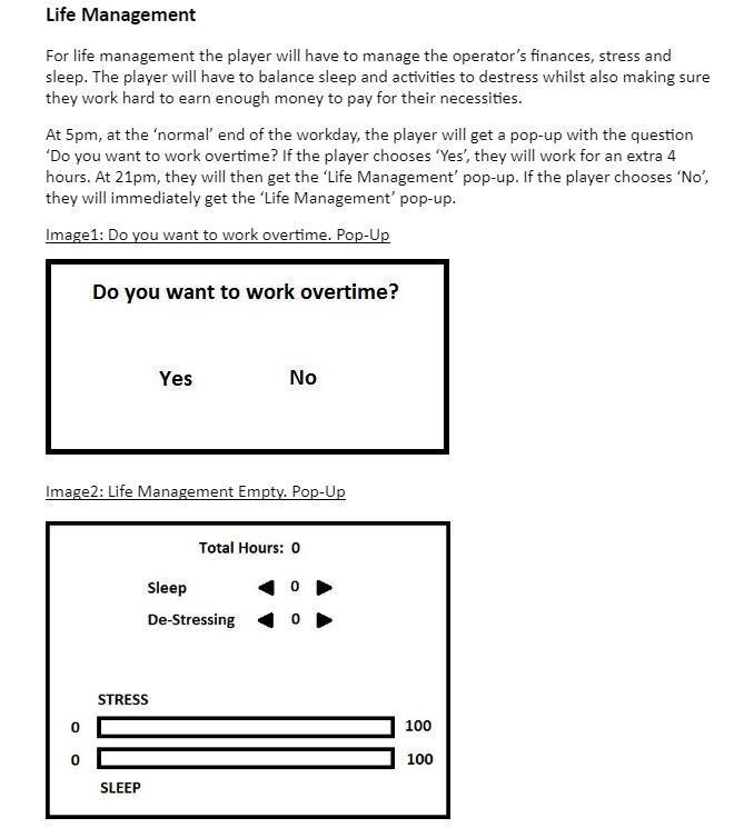 Alongside this, we made a character creation and an outside-of-work environment to emulate the complicated work-life balance of emergency call operators. This area of the game also allowed us to highlight the mental health tole of the work these operators undertake. My main role in this was creating the document for one of the players to use and ensuring the team was running coherently and that everyone understood what was required from them.