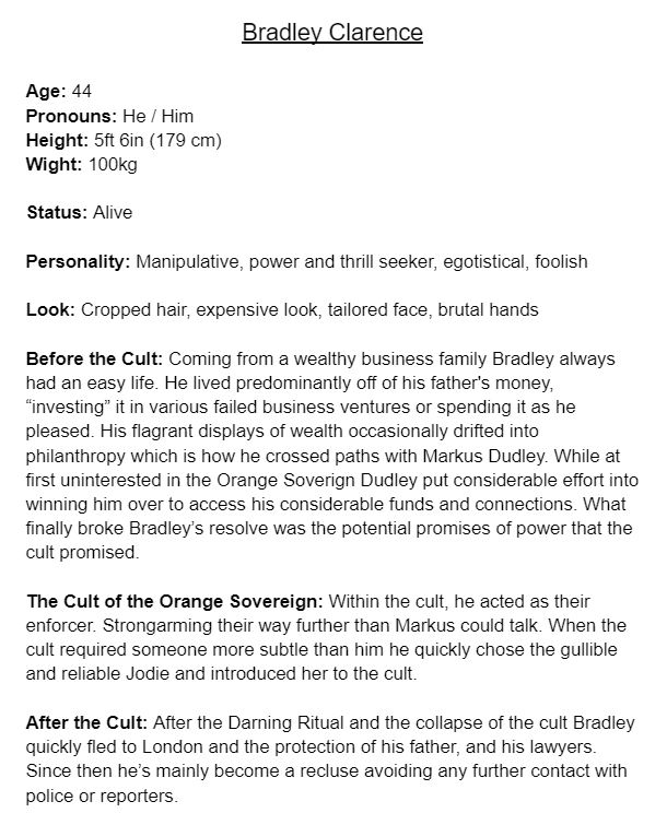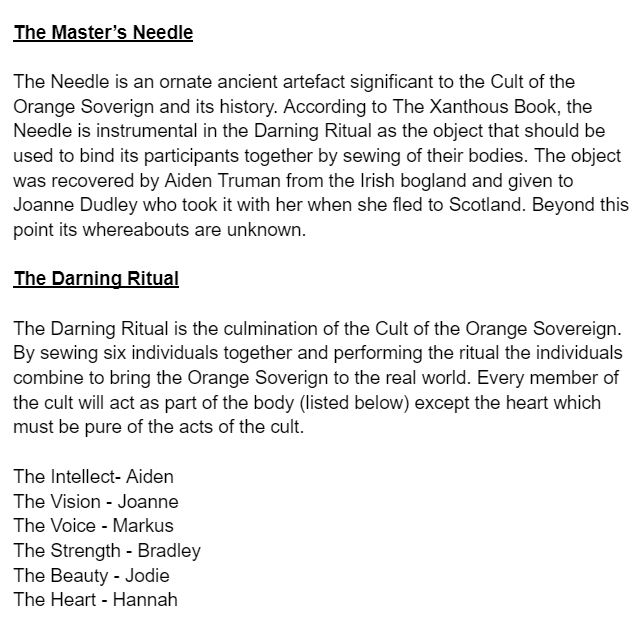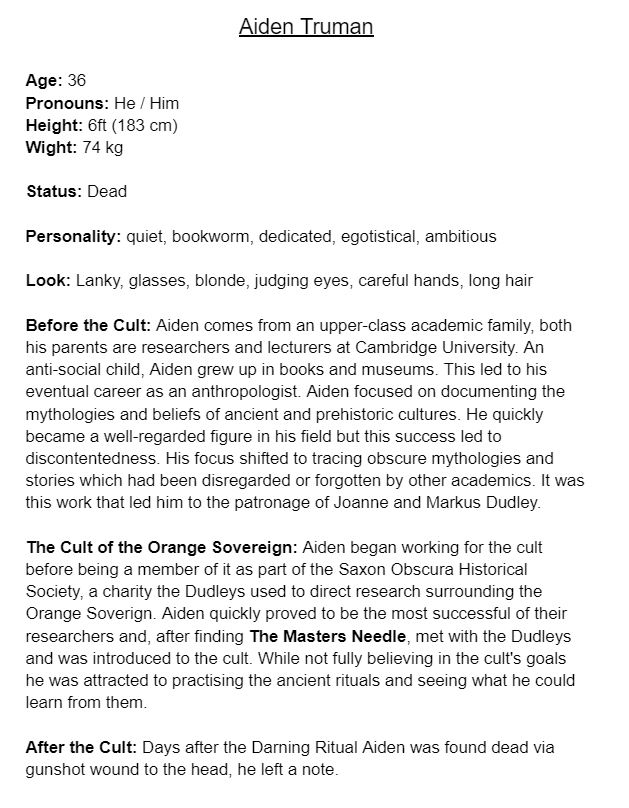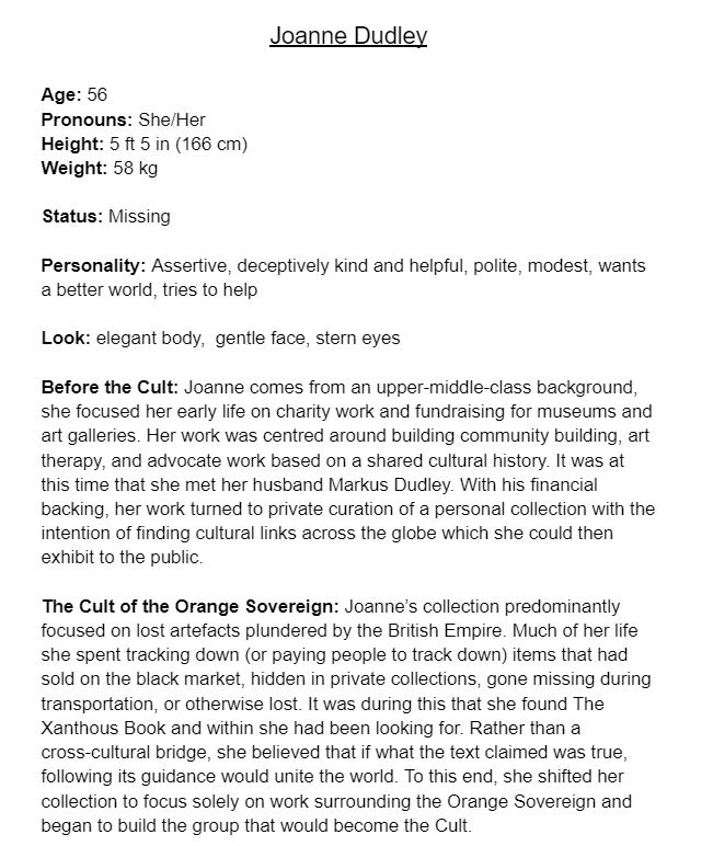 Finally, planning the game’s story involved three steps. The first was making character profiles for the important characters in the case and outlining the mythos of the cult and their beliefs. Then the second and third documents were made together, one was a timeline of the characters and their involvement in the case (including areas of ambiguity for players to theorise over) and the other was a complete list of every document I would need to make to communicate the story to the player in an interesting way. Both of these documents were somewhat fluid during development with the timeline changing order and new documents being added to fill gaps I did not foresee.