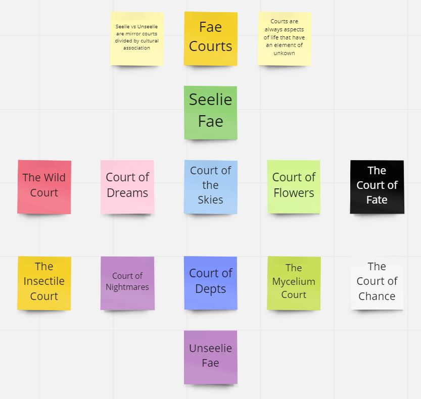 The design process for The Witch of Wish Mountain started with my interest in fae and fairy folklore. As this isn’t a common genre or style I sat down and defined what fae is to me (1st image below). From this definition I realised a strong part of my perception of the fae involved their domains or courts that they controlled. Using folkloric beliefs as a base, the courts came to occupy elements of the world that are unknowable to real-world humans. These courts were then split in two with one (the Seelie fae) representing lighter and traditionally “good” ideas and the other (the Unseelie fae) representing darker and traditionally “evil/bad/scary” ideas (2nd image below). Through this process, I found another aspect of fae that was deeply important to me was their gender. Fae and fairies tend to be seen as more fem/feminine yet in these stories the women present act in very nongendered or even masculine ways. Alongside this, there are a number of myths and stories that do feature men that are outside of the public consciousness. This complicated relationship with gender led me to decide that all fae would be fae gendered (meaning they use fae/faer/faers pronouns) to address the relationship while further distancing the fae characters from societal norms. All of these ideas combined with traditional tropes from fairytales to form the six possible location to visit in the game (3rd image below).
