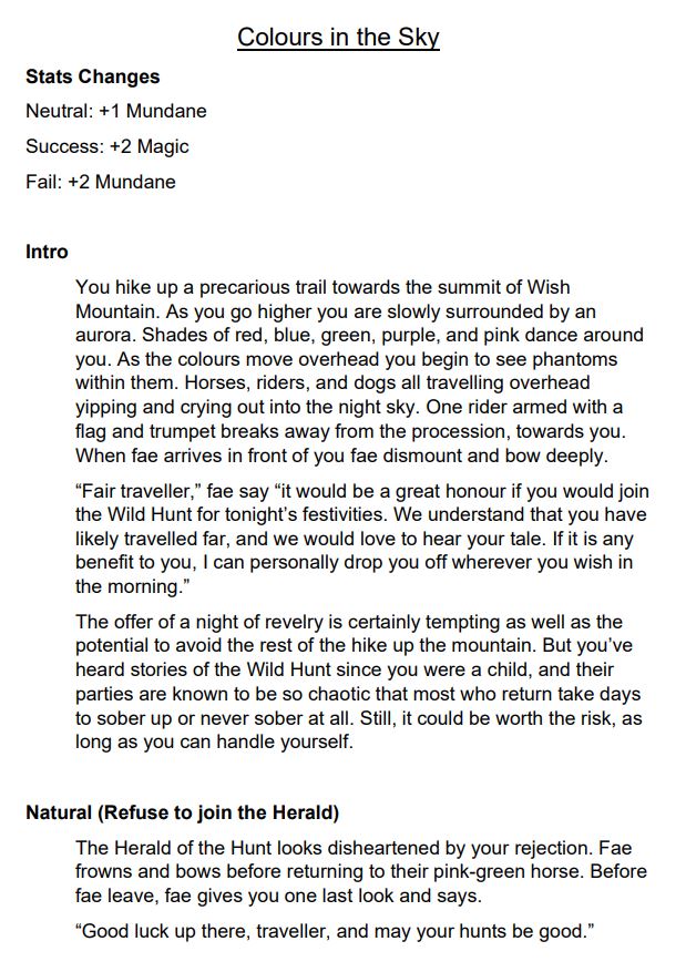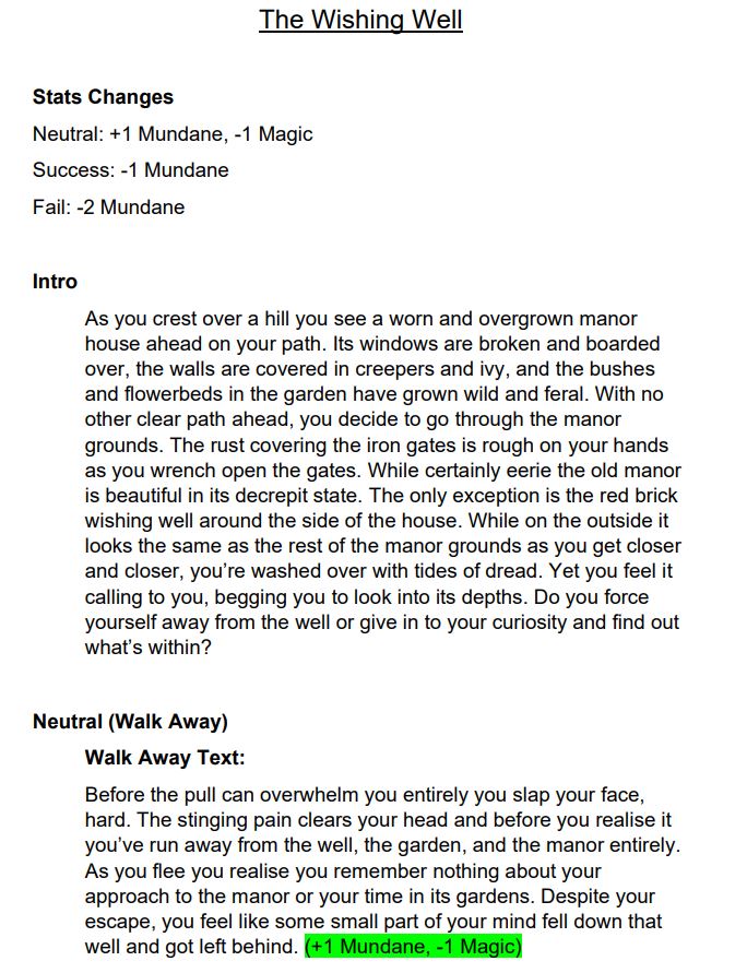 Beyond here the design process drew on text adventures and choose your own adventure books. Both of these genres take mechanical inspiration from TTRPGs and so I decided to do the same. I chose the 2-stat system which used d6s and revolved around balancing two stats between a value of 0 and 6 without hitting those extremes. This mechanic also emphasised an element of the fae a found interesting, that being humanity’s inability to interact with them for prolonged periods of time without serious consequences (such as in Alice in Wonderland). As a result, I named the 2-stats magic and mundane to represent the two worlds the player straddles during play. Once all this was decided the game become a simple process of writing all the text required for the game’s narrative and implementing it in the Unity plug-in Fungus (chosen for its simplicity and ease of use).