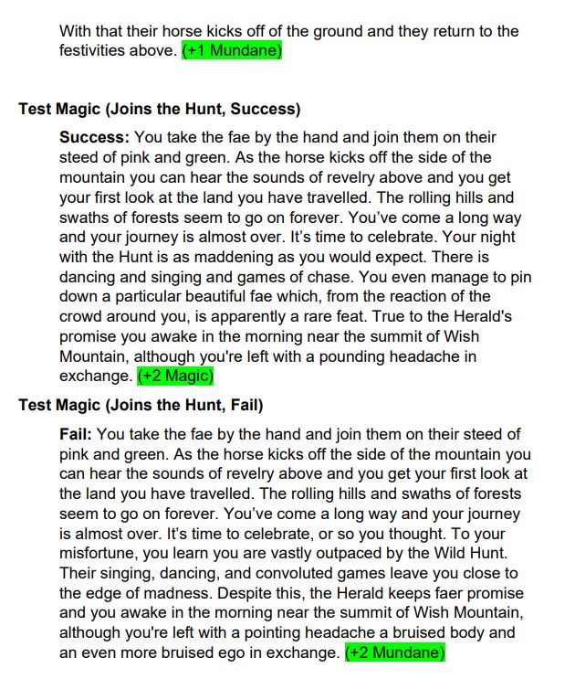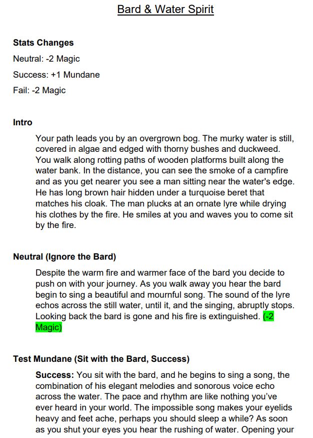 As The Witch of Wish Mountain is mostly a text adventure the core piece of documentation became a combination of game script and numerical tracker of how and when the player’s stats changed throughout the game. Below is a sample of the documentation for 3 different encounters in the game.