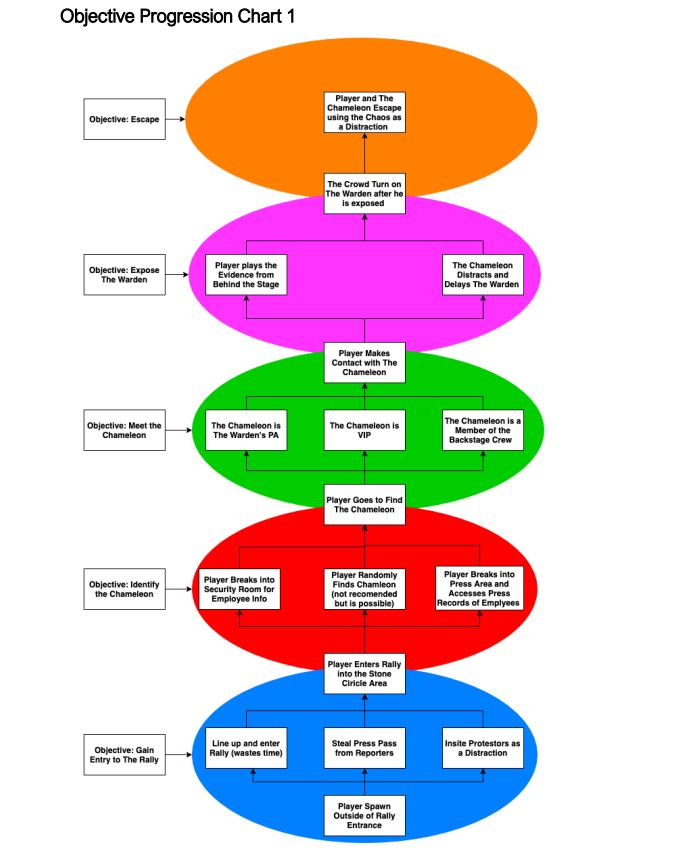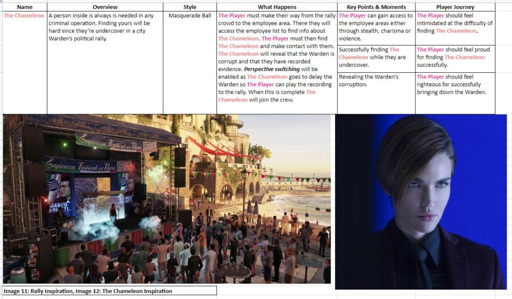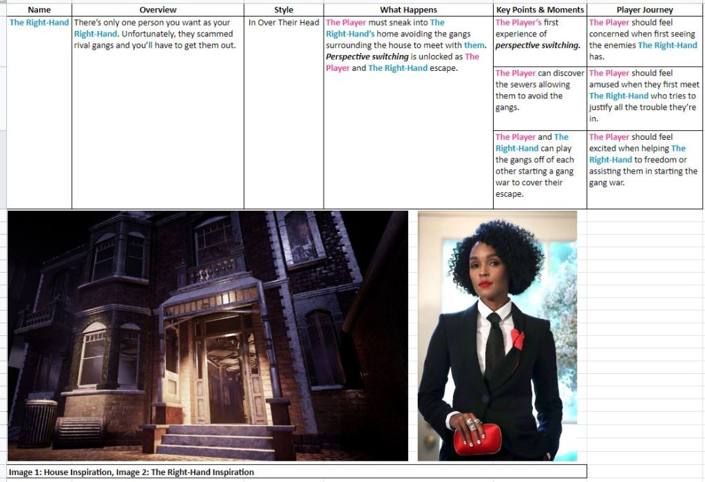 This game took place in an urban fantasy setting with a magic system inspired by witchcraft and alchemy. A level plan spreadsheet covering all ten levels in the game can be found below alongside an in-depth design document for The Vinarite Heist’s sixth level.